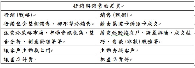 這問題就如同牛樟哥常跟大家分享的”勿把冇樟當牛樟”一樣,因為冇樟與牛樟是容易被混淆的,而行銷與銷售,更如同孿生兄弟,讓人分不清,但我們經由以下表格的整理就一目了然。