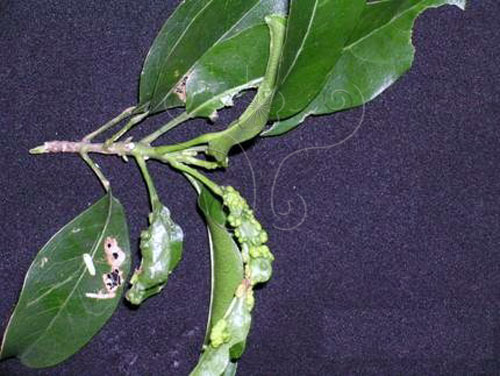 其造癭節蜱為降真香瘤節蜱,造成葉背不規則凸起的癭,嚴重時使葉片捲曲變形,將捲曲處翻開,可見少數棕色絨毛,其內有乳白色節蜱在活動。癭出現時間由春天至秋末。